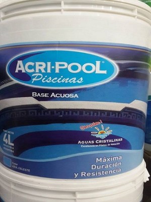 PINTURA PARA PISCINAS ACRI-POOL está formulada a base de polímeros acrílicos puros, pigmentos no degradables al agua y dióxido de titanio. Debido a su desarrollo específico es resistente a los rayos solares, y no altera su color, ni su poder cubritivo frente a los productos clorados utilizados en los natatorios.