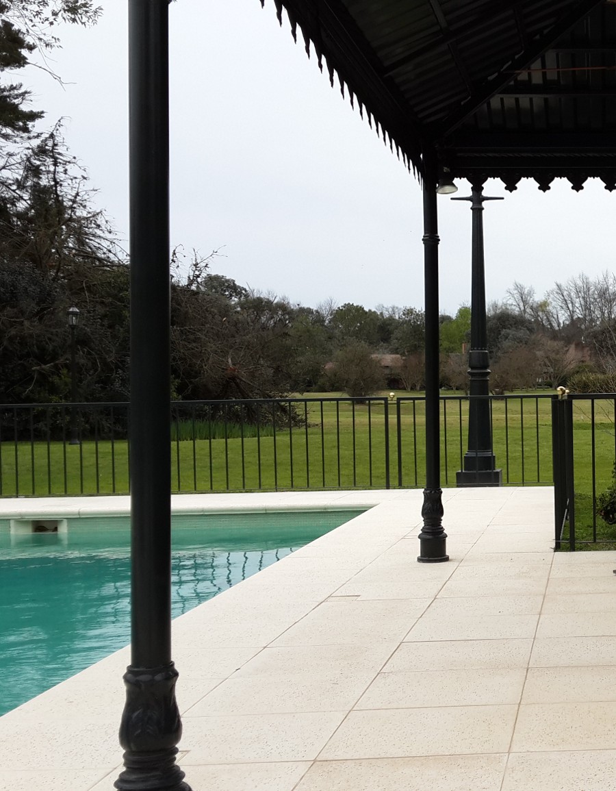 Atento a las recomendaciones del Arquitecto Marcelo Villieri, Alejandro "Nano" Salas no dudó en diseñar la mejor alternativa para responder al requerimiento del cliente. El entorno de esta piscina es especial; sobre el solarium se colocó una pérgola con columnas de hierro y ventiladores de techo para soportar el calor del verano...uno imagina allí a los más jóvenes preparando tragos para los invitados.